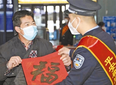 春运期间,为了给旅客营造良好的出行环境,太原铁路公安局大同公安处强化爱民便民举措,大力开展温暖旅客回家路活动。图为大同南站民警为旅客送春联、送“福”字。