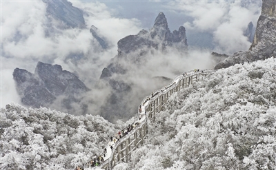 1月16日,湖南省张家界天门山景区银装素裹,吸引众多游客前来观赏雪后美景。