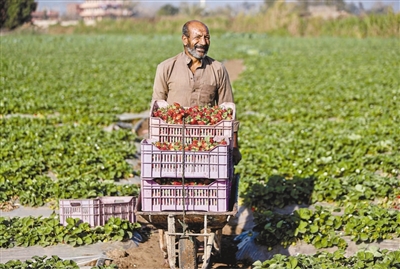 当前,埃及已进入草莓冬季收获的季节。图为近日,埃及盖勒尤卜省的农民在一处农场搬运草莓。