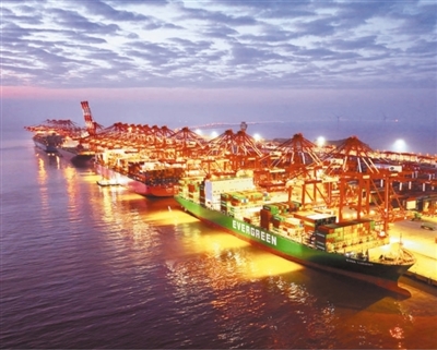 上港集团洋山四期自动化码头吞吐作业繁忙有序,超大型货轮正在进行集装箱装卸作业。 计海新摄(影像中国)