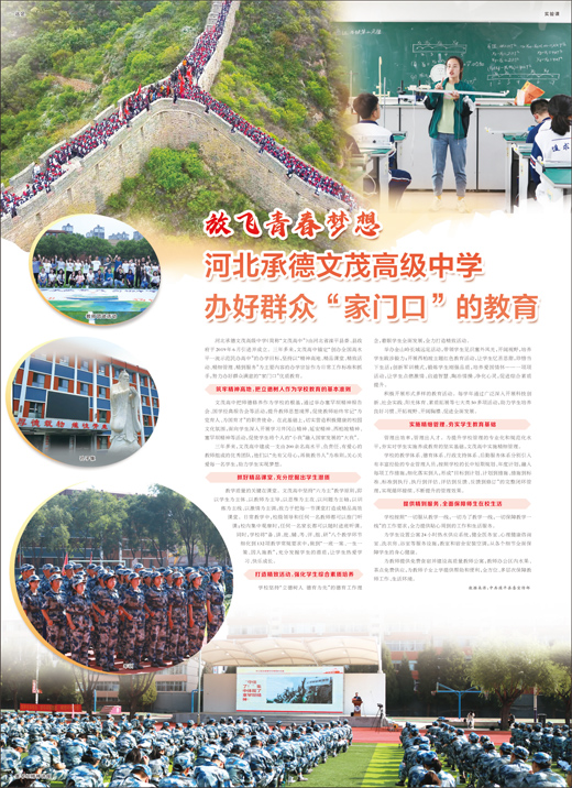 河北承德文茂高级中学(简称“文茂高中”)由河北省滦平县委、县政府于2019年6月引进并成立。三年多来,文茂高中锚定“创办全国高水平一流示范民办高中”的办学目标,坚持以“精神高地、精品课堂、精致活动、精细管理、精到服务”为主要内容的办学宗旨作为日常工作标准和抓手,努力办好群众满意的“家门口”优质教育。