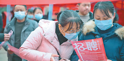 图为2月1日,专场招聘会现场,求职者在认真阅读相关招聘信息。