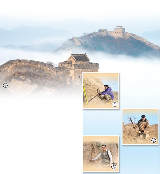 图①:鲁婷婷在对万里长城第一墩进行测量检测。 |
