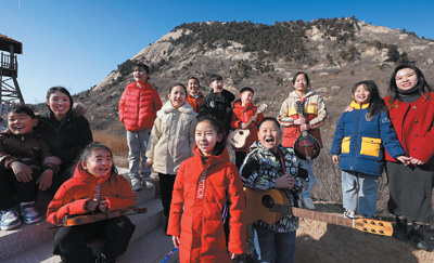 马兰村的老师带领马兰小乐队和马兰花儿童声合唱团的孩子们,在铁贯山上排演节目,放声歌唱。 |