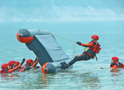 四川省森林消防总队钻研水域救援技术,从严从难开展救援培训,进一步提升消防救援人员的专业化水平。图为在紫坪铺水库,四川省森林消防总队阿坝州支队进行翻舟自救训练。