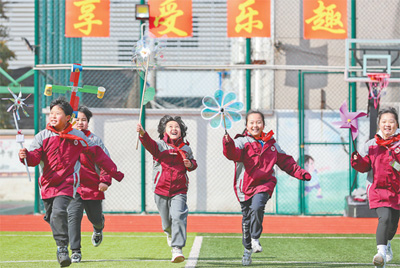 2月15日,上海市松江区岳阳小学,孩子们手持风车在校园里开心地奔跑。近日,上海市约165万名中小学生和53万名幼儿迎来开学,孩子们在校园里尽享运动乐趣,拥抱新学期的到来。