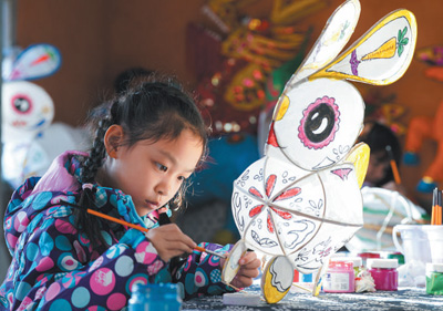 游客在安徽省黄山市黟县宏村花灯研习班上制作“兔灯”。 新华社记者 杜 宇摄