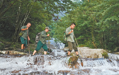 在广西元宝山国家级自然保护区,罗定明(右一)和同事在巡护路上涉水而行。 |