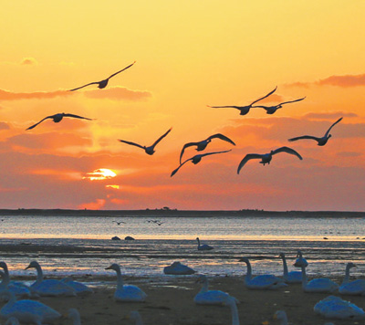 山东省荣成市天鹅湖,一群大天鹅映着朝晖飞舞。 王福东摄(影像中国)
