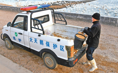 保护区工作人员给大天鹅准备食物。 新华社记者 李紫恒摄