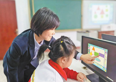 图为闫蕊(左)在教学生识别图案。 |