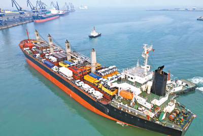 二月二十三日,装载着一百九十多台工程车辆的中非班轮“塔内斯梦想”轮从山东港口烟台港起航前往坦桑尼亚达累斯萨拉姆港。