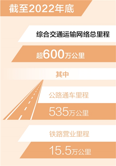 基础设施网络日益完善。截至2022年底,全国铁路营业里程达15.5万公里,其中高铁4.2万公里;公路通车里程535万公里,其中高速公路17.7万公里;港口拥有生产性码头泊位2.1万个,全国内河航道通航里程12.8万公里;民用颁证机场达254个;共有53个城市开通运营城市轨道交通,运营总里程9584公里;实现具备条件的乡镇和建制村全部通硬化路、通客车;邮政实现“乡乡设所、村村通邮”。