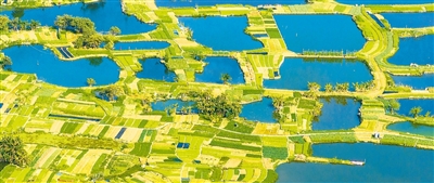 近年来,广西梧州市依托资源优势,大力发展生态蔬菜种植、生态水产养殖,全面推进乡村振兴,促进农民增收。图为2月26日,梧州市长洲岛绿色蔬菜生产基地内,菜地与鱼塘相映成趣。