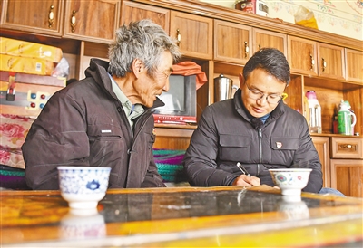 扎西江村代表(右)在慰问老党员索朗,了解搬迁群众生活情况。 |