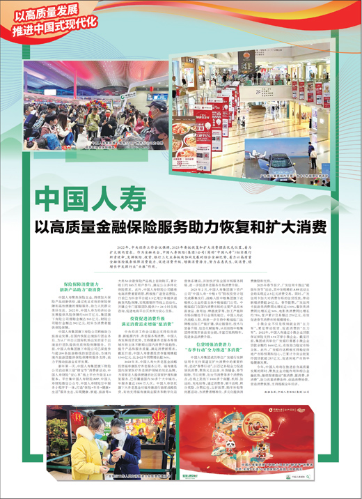 2022年,中央经济工作会议强调,2023年要把恢复和扩大消费摆在优先位置,着力扩大国内需求。作为金融央企,中国人寿保险(集团)公司(简称“中国人寿”)切实履行职责使命,发挥保险、投资、银行三大业务板块协同发展的综合金融优势,着力以高质量金融保险服务保障消费能力、促进消费升级、增强消费潜力,努力在惠民生、促消费、稳增长中发挥行业“头雁”作用。