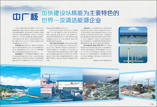 中国广核集团有限公司(简称“中广核”)以“发展清洁能源,造福人类社会”为使命,40多年来积极落实国家战略要求,逐步发展成为以核能为主要特色的世界一流清洁能源集团。近年来,中广核优化构建“6+1”产业体系,涵盖核能、核燃料、新能源、非动力核技术应用、数字化、科技型环保和产业金融。截至2022年12月31日,控股在运清洁电力装机容量超过7700万千瓦。