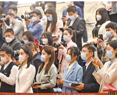 3月7日,全国政协十四届一次会议第二场“委员通道”开启。图为参与集体采访的记者。