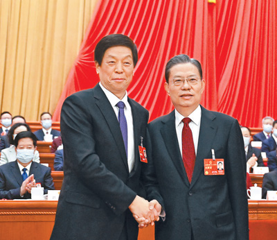 三月十日,十四届全国人大一次会议在北京人民大会堂举行第三次全体会议。赵乐际当选为第十四届全国人民代表大会常务委员会委员长。这是赵乐际同十三届全国人大常委会委员长栗战书握手,相互致意。 新华社记者 李学仁摄