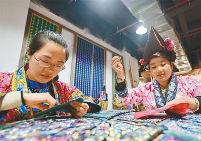 说话的人叫韦祖英(见上图,右,吴德军摄),只见她头戴银饰,身着齐膝百褶裙,辅以围腰束之,衣领、裤脚搭配鲜亮绣片。打量一番后,记者不禁疑惑,“明明年纪不大,咋有这么多年刺绣经验?”