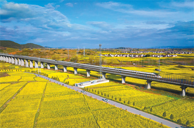 近日,陕西省汉中市洋县的油菜花盛开,一列动车组列车飞驰在花海之上。