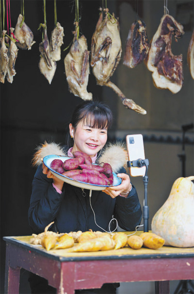 江西省宜春市万载县双桥镇黄源村,农村电商主播正通过网络直播销售农特产品。 |