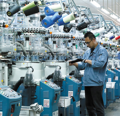 山东青岛市即墨区青岛华盛袜业有限公司,制袜工人在生产出口产品。 |