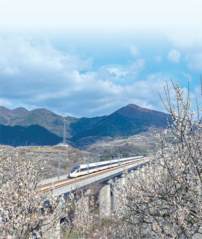 一列动车正穿越我国首条民营控股高铁——杭台高铁浙江嵊州市剡湖街道碑山段的梅林。 |