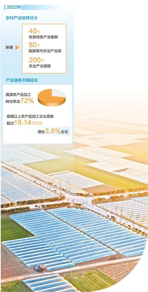 基础不断夯实,链条持续延长。今年的中央一号文件提出,“加快粮食烘干、农产品产地冷藏、冷链物流设施建设”“做大做强农产品加工流通业”。2022年,我国农产品加工转化率达72%,规模以上农产品加工企业营业收入超过19.14万亿元、增长3.6%左右,支持各类经营主体建设1.6万多个农产品产地冷藏保鲜设施。