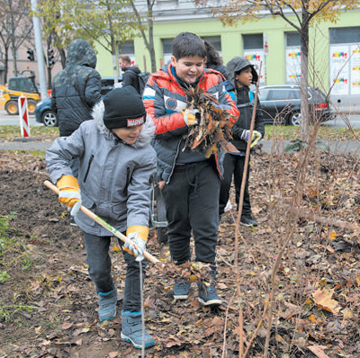 工人和儿童们在奥地利维也纳市内的公园种植迷你森林。 |