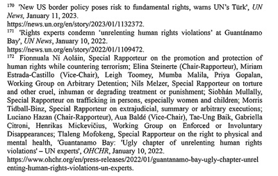 拒不关闭关塔那摩监狱。2002年设立的关塔那摩监狱最多时曾关押约780人,其中大多数人未经审判便遭拘留,受到了残忍的、不人道的待遇,是美国“肆意侵犯人权的一个丑陋篇章”171。联合国人权理事会在反恐中促进和保障人权问题特别报告员菲奥努阿拉·尼奥莱因等多名独立专家2022年1月发表共同声明指出,臭名昭著的关塔那摩监狱是美国在人权保护上的污点,要求美国政府关闭关塔那摩监狱,对遭受酷刑、任意拘留的公民进行赔偿,并根据国际法追究授权和实施酷刑的人员的责任172。