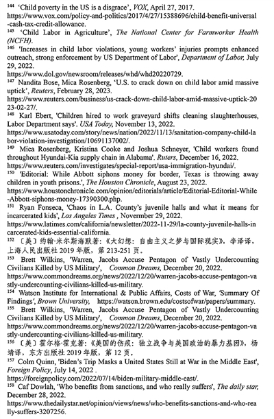 非法使用童工现象屡禁不止。根据非营利组织“美国农场工人健康中心”的数据,美国有30万至80万名未成年人在农场工作145。美国《石板》网络杂志指出,美国很多快餐店违反保护儿童健康与教育的规定,雇用青少年超时工作。童工问题屡禁不止,根源是美国法律体系存在漏洞。受新冠疫情和供应链危机影响,美国多地出现“用工荒”现象,多州批准新法案延长未成年人工作时间。根据美国劳工部的数据,2022年,美国有数百万青少年受雇在农业、食品服务、零售、娱乐和建筑行业工作146。路透社2023年2月28日报道,美国非法雇用童工问题日益严重,自2018年以来,被非法雇用的童工激增了近70%。根据美国劳工部的数据,2022财年有835家企业违法雇用3800名儿童,受雇专门从事危险工作的儿童增加了26%147。《今日美国报》2022年11月13日报道,威斯康星州帕克斯清洁服务公司雇用了30多名13至17岁的未成年人在肉类加工厂和农场担任清洁工。几名未成年雇员在工作中受伤,其中一名13岁儿童被腐蚀性清洁化学品烧伤148。路透社2022年12月16日报道,在亚拉巴马州至少有四家汽车零部件供应商被发现雇用童工,劳务派遣机构将未成年人移民安置在工厂工作149。时至今日,美国仍是联合国193个会员国中唯一没有批准《儿童权利公约》的国家,解决雇用童工问题的前景依然黯淡。