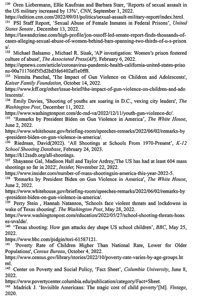 枪祸横行威胁儿童生命安全。凯泽家庭基金会2022年10月14日发表报告指出,2011年至2021年,美国近18500名17岁及以下的儿童死于枪支暴力。2021年平均每天有7名儿童死于枪击133。《华盛顿邮报》2022年12月11日报道,2022年美国有超过5800名18岁以下的儿童因枪击受伤或死亡。截至2022年12月1日,涉及儿童的致命枪击事件比2021年增加了一倍多,涉及儿童的非致命枪击事件也增加了80%以上134。美国总统拜登2022年6月公开承认:“枪击已成为美国儿童第一大死因,死于枪击的儿童比死于车祸和癌症的儿童还要多。135”
