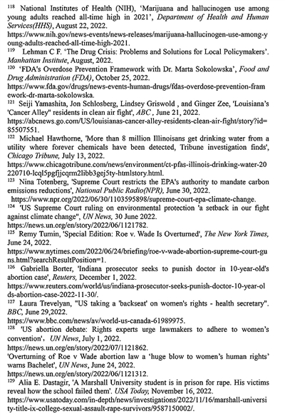 治理缺位危害环境权。美国广播公司2022年6月21日报道,在路易斯安那州,大量排放的工业废料致使密西西比河沿岸出现诸多“癌症巷”地区,该地区民众因空气污染而患癌的风险较美国其他地区高出95%121。《芝加哥论坛报》2022年7月13日报道,在伊利诺伊州,占当地人口约60%的逾800万居民的饮用水中,检测到至少含一种可能有损健康的“永久性化学物质”122。在环境形势日趋恶化的背景下,美国联邦最高法院却于2022年6月裁定,美国环境保护局无权在未得到美国国会授权的条件下,在州层面限制温室气体排放量,也不得要求发电厂放弃化石燃料转用可再生能源123。联合国秘书长发言人杜加里克指出,美国联邦最高法院的这一裁决,是“全球应对气候变化的一次挫折”124。