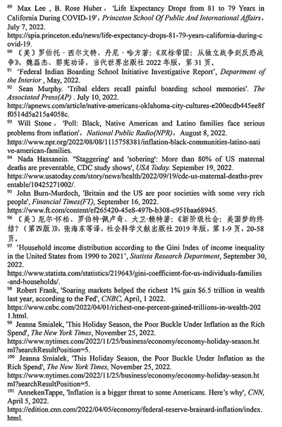 人均预期寿命大幅下降。美国疾病控制和预防中心下属全国健康状况统计中心2022年8月发布的报告显示,2019年至2021年,美国人均预期寿命下降了2.7岁,至76.1岁,降至1996年来新低。其中非拉美裔美洲印第安人、阿拉斯加原住民群体的人均预期寿命降幅最大,达到了惊人的6.6岁107。在和平时期,人均预期寿命大幅下降是罕见的。美国疾病控制和预防中心发布的数据显示,截至2022年12月29日,美国累计新冠死亡病例超过108万人,其中2022年新冠死亡病例超过26万人108。德国《世界报》2023年1月15日报道称,人均预期寿命或许是衡量一个国家生活质量有多好,甚至在某种程度上是衡量一个国家有多伟大的最重要标准,美国政客却对此讳莫如深。除新冠疫情外,造成美国人均预期寿命急剧下降的原因还包括药物滥用、枪支泛滥等109。弗吉尼亚联邦大学、科罗拉多大学博尔德分校和城市研究所的学者在《英国医学杂志》上发表的共同研究指出,美国健康水平的不断恶化、死亡率高企以及对少数族裔的持续不公,很大程度上是长期政策选择和系统性种族主义的产物。因新冠疫情造成的大量死亡,不仅体现了美国对疫情大流行的政策选择和不当处理,也反映了几十年来导致美国健康水平恶化的根深蒂固的原因110。