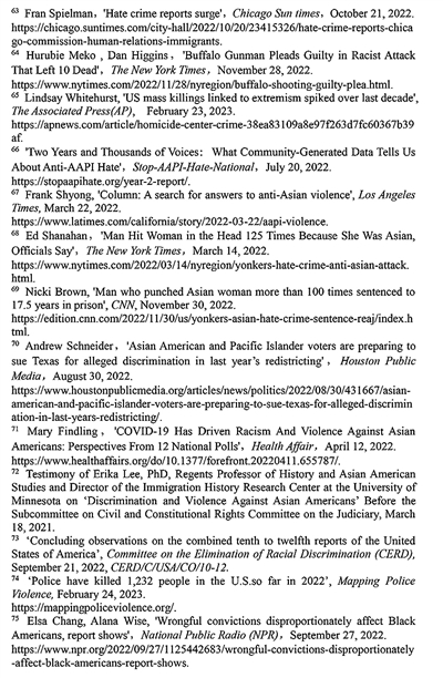 针对亚裔的仇恨犯罪尤为猖獗。“停止仇恨亚裔及太平洋岛民”组织2022年7月20日发布的报告显示,2020年3月19日至2022年3月31日,该组织共收到近11500起仇恨事件报告66。《洛杉矶时报》2022年3月22日报道,亚太裔数据研究组织的在线民意调查发现,2021年全国每6个亚裔美国人中就有1人经历过基于种族的暴力67。《纽约时报》2022年3月14日报道,一名28岁男子在曼哈顿对7名亚裔女性进行长达两小时的疯狂袭击。在过去几个月,纽约市有4名亚裔在遭到袭击后死亡68。美国有线电视新闻网2022年11月30日报道,一名男子在纽约扬克斯对一名亚裔老年妇女拳打100多次,对其进行种族主义辱骂,反复踩踏她的身体并向她吐口水69。休斯敦公共广播电台2022年8月22日报道了旧金山市多起亚裔人士遇袭事件,受害者艾米·李说,她几乎每天都在附近看到肇事者,“我已经报告了警方,但没有听到任何回应,我和儿子每天都生活在恐惧中。70”医学杂志《健康事务》2022年4月12日发表报告指出,57%的亚裔美国人表示由于种族或族裔原因经常或有时在公共场合感到不安全,81%的亚裔美国人认为针对亚裔社区的暴力行为正在增加,73%的亚裔美国人表示与新冠疫情大流行之前相比,现在面临的暴力威胁更大71。明尼苏达大学历史系教授李漪莲在关于针对亚裔种族仇恨犯罪的美国国会听证会上发言指出:“当今亚裔美国人和太平洋岛民面临的种族歧视和暴力行为,并非是由精神错乱的个人随意犯下的罪行,而是一个系统性的国家悲剧。它反映了美国针对亚裔的系统性种族主义的悠久历史。72”