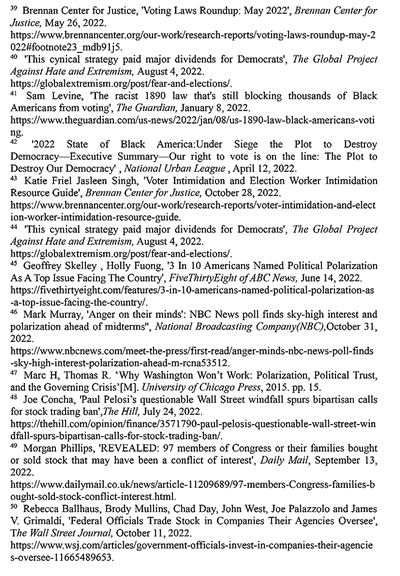 美式选举伴随暴力与恐吓。美国政治史上一直不乏暴力与恐怖。历史上,臭名昭著的“三K党”等团体曾以殴打、私刑、暗杀等暴力形式阻止非洲裔投票,造成的恐惧心理阴影延续至今。布伦南司法中心2022年10月28日发表的研究指出,美国选民在投票时会受到来自民间团体的恐吓。在亚利桑那州,右翼极端主义团体招募志愿者监视投票箱,这些志愿者经常全副武装出现在投票现场43。“全球反对仇恨和极端主义组织”2022年8月4日发布的报告指出,美国民众的恐惧感日益增加,少数族裔尤其关注投票安全,选民普遍对投票站的安全性感到担忧,63%的受访者表示,他们“非常担心”会在投票站遭遇暴力、骚扰或恐吓44。私刑心理阴影与恐惧氛围成为选民行使选举权的极大障碍。