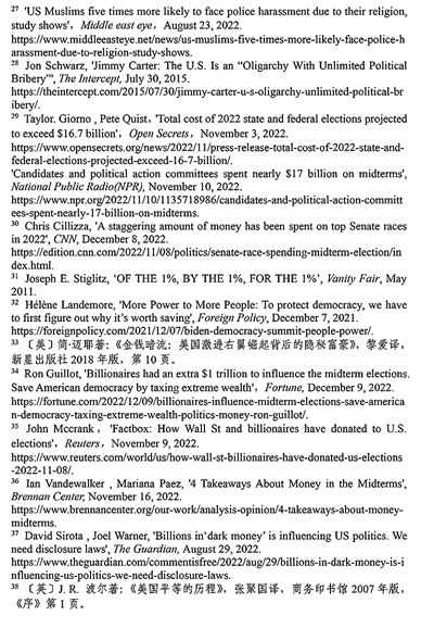政治献金缔造寡头政治。美国政治被资本绑架,存在稳定的“金钱—回报”关系,“民有、民治、民享”变成了“1%的人所有、1%的人治理、1%的人享用”,正如“占领华尔街运动”的标语所示:“我们是99%的民众,但被1%的人所控制”31。耶鲁大学政治学教授海伦·兰德摩尔2021年12月在《外交政策》发表文章指出,美国的民主“缺少了真正来自人民的力量”32。“占人口极小部分的极富阶层可以利用极高的经济地位来推动一套政策优先服务于他们。33”《财富》杂志网站2022年12月9日发表题为《亿万富翁有额外的万亿美元来影响中期选举》的文章指出,截至10月底,美国亿万富翁在选举中的花费高达8.8亿美元,最终总额可能接近10亿美元,亿万富翁正以前所未有的方式提供选举资金。美国税收公平组织执行董事弗兰克·克莱门特表示,亿万富翁的财富一直在“淹没我们的民主”34。路透社2022年11月9日报道,自2021年1月1日至2022年9月30日,美国亿万富翁的政治献金占所有联邦政治项目献金的15%,远高于2020年选举周期的11%。美国富豪乔治·索罗斯是出资最高的个人捐赠者,其政治献金超过1.28亿美元35。富豪以金钱开路,操控选举结果,美式选举越来越背离民主的本质。