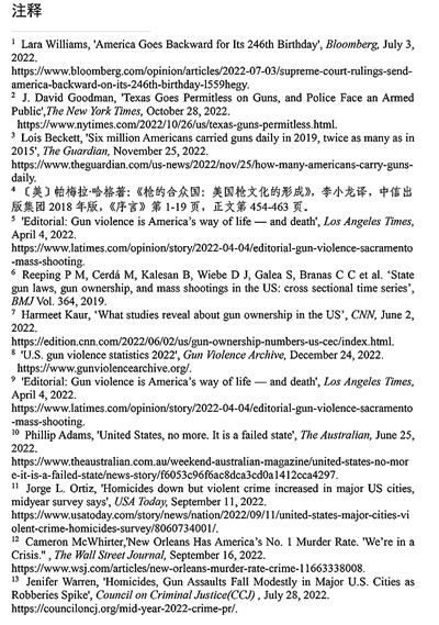 政商勾结瘫痪控枪议程。美国枪支利益集团为维护自身利益,开展强大政治游说。政府罔顾民意大幅放松枪支管制范围,允许在医院、学校、酒吧以及体育馆等人员密集的公共场所携枪。彭博新闻社2022年7月3日报道,联邦最高法院6月23日对“布鲁恩案”的裁决,推翻了纽约州和其他六个州长达半个世纪的控枪立法,使这些州居民可以携带隐藏枪支,成为美国控枪领域的标志性倒退1。《纽约时报》2022年10月28日报道,得克萨斯州一个联邦法院裁定,禁止21岁以下成年人携带手枪的州法律违宪。目前美国近一半的州放松了持枪限制2。华盛顿大学教授鲁哈尼·拉赫巴尔表示:“从整体上看,在过去二三十年里,这个国家对持枪的法律控制明显呈现大幅放松的趋势。3”美国学者帕梅拉·哈格所著《枪的合众国:美国枪文化的形成》一书指出,枪支在美国是一条“开始于生产线加工,结束于受害者死亡”的产业链。“美国枪支暴力的悲剧起源于世俗的枪支贸易。4”