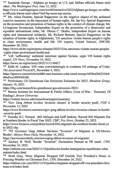 长期肆意实施单边制裁。近年来,美国对其他国家实施的单边制裁呈指数级增长,极大削弱了被制裁国家人权保障的能力与水平。孟加拉国《每日星报》2022年12月28日报道,美国实施的单边制裁总数为世界之最,目前仍在对20多个国家实施制裁,包括1962年以来对古巴的制裁、1979年以来对伊朗的制裁、2011年以来对叙利亚的制裁,以及近年来对阿富汗的制裁,导致被制裁国家无法向其人民提供基本的食物和药品158。《华盛顿邮报》2022年6月13日报道,近一半的阿富汗人没有足够的食物,儿童营养不良呈上升趋势159。2022年12月20日,多名联合国人权理事会独立专家发表共同声明指出,美国政府对伊朗的制裁加剧了伊朗的环境危害,使所有在伊朗的民众无法充分享受健康权和生命权,侵犯了伊朗人民享有清洁环境的权利160。联合国单边强制措施对人权负面影响问题特别报告员阿莱娜·杜晗2022年11月10日指出,单边制裁加剧了叙利亚人民的苦难,是对人权的严重侵犯161。美国政府肆意实施制裁引发他国人权危机受到国际社会强烈谴责。2022年11月3日,联合国大会就敦促美国终止对古巴的经济、商业和金融封锁进行投票表决。在193个成员国中,多达185个国家支持谴责美国对古巴的禁运162。这是联合国大会连续30次通过类似决议。