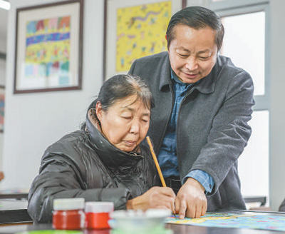 潘宇(右)指导69岁村民潘金云创作农民画。通过学习,没有绘画基础的潘金云已可以独立进行农民画创作。 |
