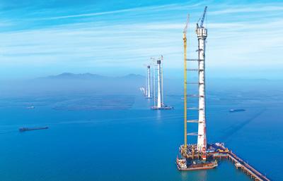 黄茅海跨海通道项目跨海段设置高栏港大桥和黄茅海大桥2座主桥,共5个主塔。项目预计2024年建成通车,建成后,将与港珠澳大桥、深中通道等共同组成粤港澳大湾区跨海跨江通道群。图为黄茅海跨海通道建设现场。