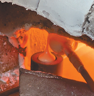 站在内温1200摄氏度的窑炉边,热气扑面而来。刘廷举的徒弟右手持圆头铁杆伸进窑炉、蘸满熔浆,快速滴落在左手中的细长铁板上,再利落地翻手收料。熔浆遇到铁板,初时赤红,随即变为乳白色,终至冷却,一颗正圆扁平的云子便具雏形。