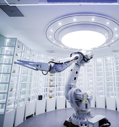 在重庆市渝中区解放碑—朝天门智慧商圈的无人超市,机械手臂正在帮助顾客拿取已购买的商品。 |