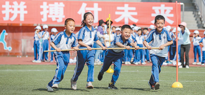 4月10日,在四川省宜宾市翠屏区棠湖学校,学生们参加趣味运动会,享受运动乐趣。