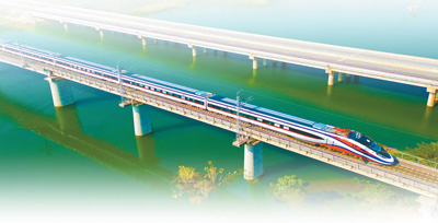 中老铁路“澜沧号”动车组列车奔驰在老挝万象省境内的欣楠里河特大桥上。 |