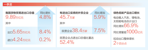 1月份,受春节假期影响,进出口下降7%。2月“由负转正”,当月增长8%,3月同比增速提升到15.5%,呈现逐月向好态势。一季度整体增长4.8%,较去年四季度提速2.6个百分点。