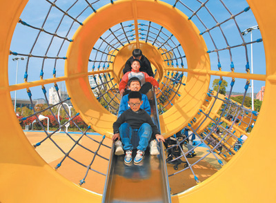 浙江省玉环市大麦屿体育“口袋公园”,孩子们在游玩。 段俊利摄(影像中国)