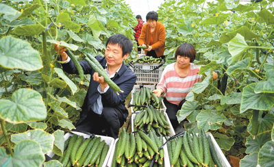 图为4月13日,年丰蔬菜种植农民专业合作社的村民在大棚里采摘黄瓜。