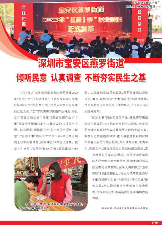 4月4日,广东省深圳市宝安区燕罗街道2023年“红芯十事”民生项目发布仪式在深圳燕川文化广场举行。“红芯十事”,“红”字代表燕罗街道厚重的红色文化;“芯”字代表燕罗街道产业特色,即以芯片制造为核心的半导体与集成电路产业;“十事”代表燕罗街道将集中力量建设的10项民生工程。仪式现场,揭牌成立“红芯十事民生项目工作室”。“红芯十事”项目于2023年3月6日正式开展线上线下问卷调查,面向辖区25万居民征集。截至3月15日,收集问卷8.6万份、意见建议4153条。以调查问卷结果为基础,燕罗街道通过反复优化、遴选,最终形成“十事百项”民生项目清单,作为燕罗街道全年民生工作的重点,于4月4日正式对外发布。